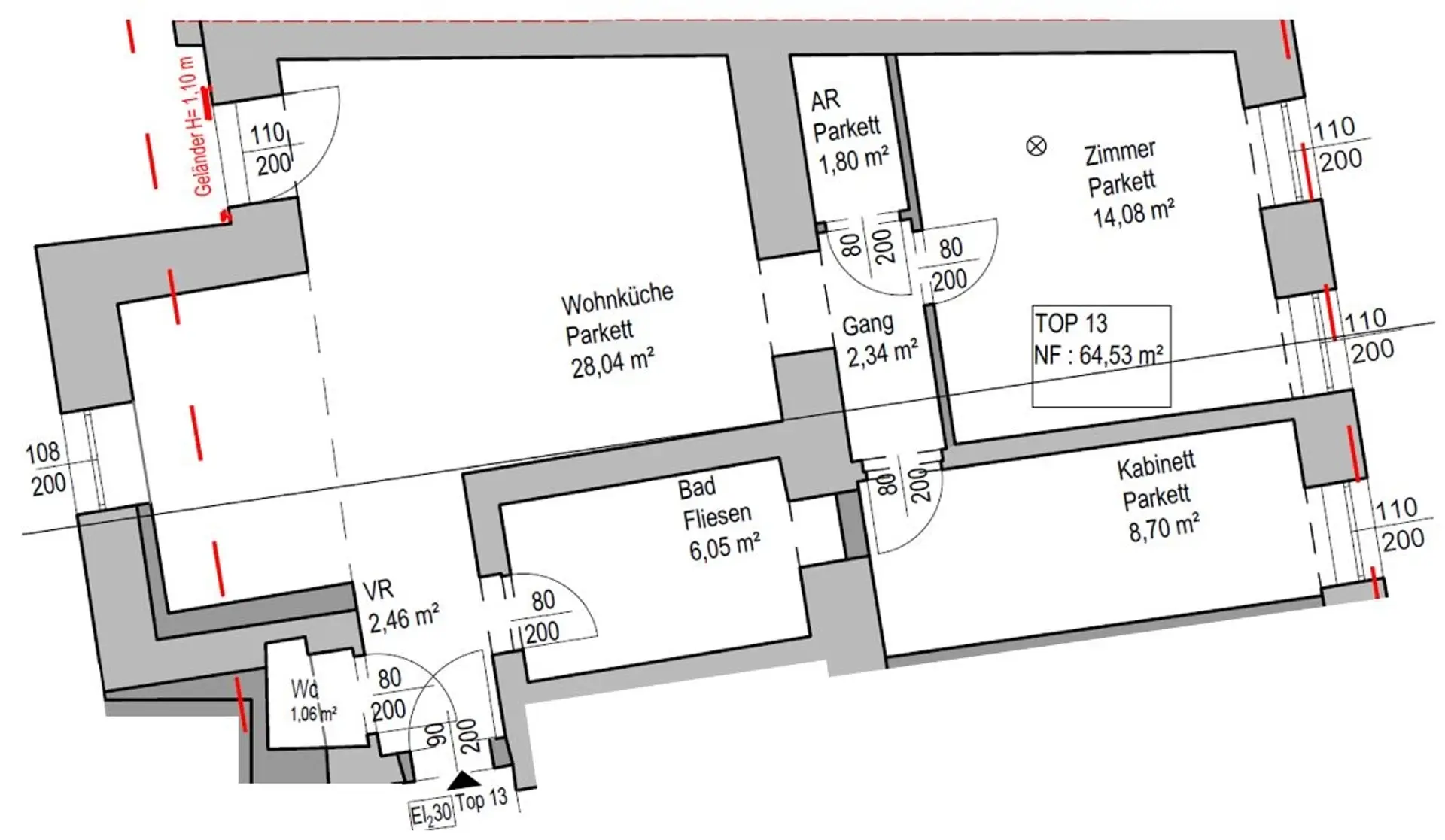Die Wohnung Top 13 verfügt über 64,53 m² und teilt sich wie folgt auf: