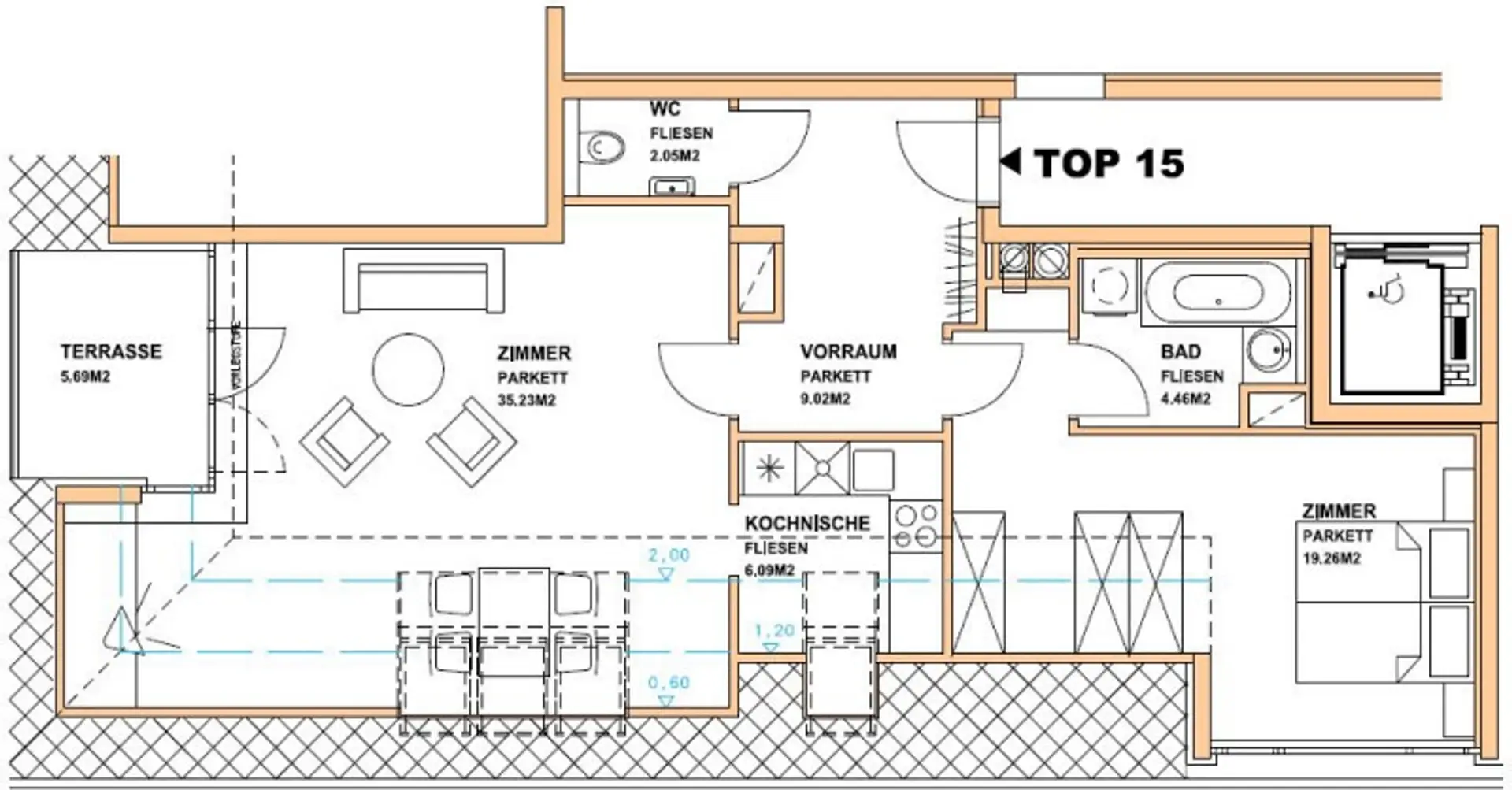 Diese moderne und klimatisierte Neubauwohnung bietet auf rd. 76m² eine großzügige Wohnküche mit Terrasse und Küchenzeile inkl. Geräten, eine separate Toilette mit Handwaschbecken, getrennt begehbares Schlafzimmer, ein Badezimmer mit Wannenbad und Handwaschbecken und Handtuchhalter/Heizkörper, Kellerabteil