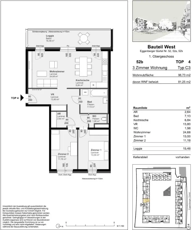 Diese ca. 96,61 m² große 3-Zimmerwohnung im 1ten Stockwerk gliedert sich in folgende Räumlichkeiten: