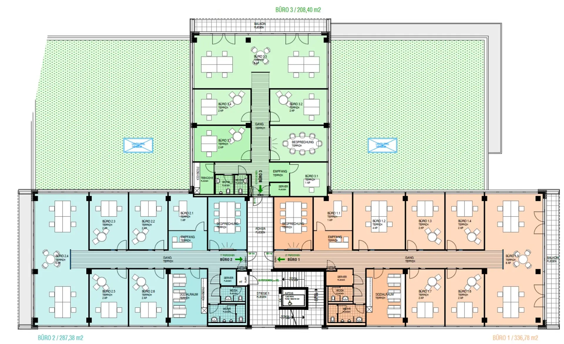 - Büro 1: 340 m² - Büro 2: 290 m² - Büro 3: 210 m² Gesamtfläche pro Geschoss: 840 m² Gesamtfläche Bauabschnitt 1: 3.360 m²