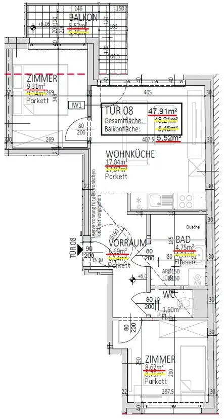 Die Wohnung T8 verfügt über 47,91m² Wohnfläche, und teilt sich wie folgt auf: