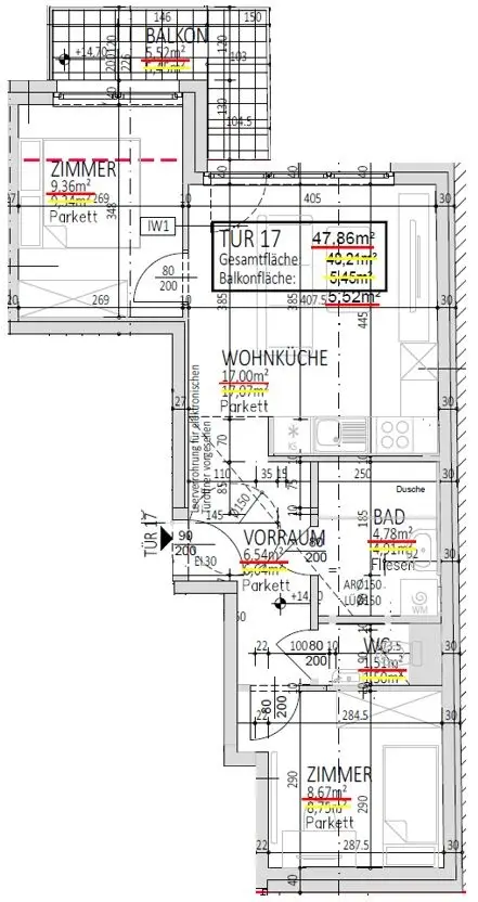 Die Wohnung T17 verfügt über 47,86m² Wohnfläche, und teilt sich wie folgt auf: