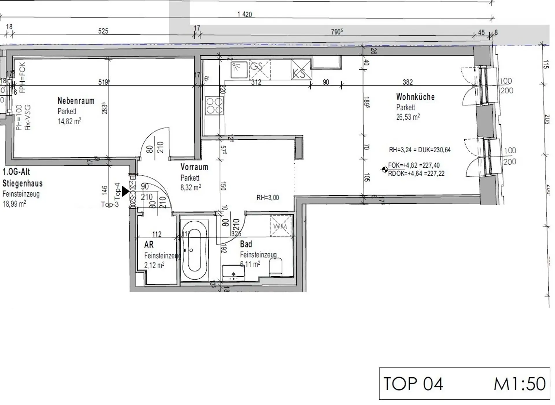 Über das zentrale Stiegenhaus oder mit dem Lift (barrierefrei), gelangen Sie in diese moderne, südseitig ausgerichtete Wohnung, mit einer beeindruckenden Raumhöhe von ca. 3,10 m.