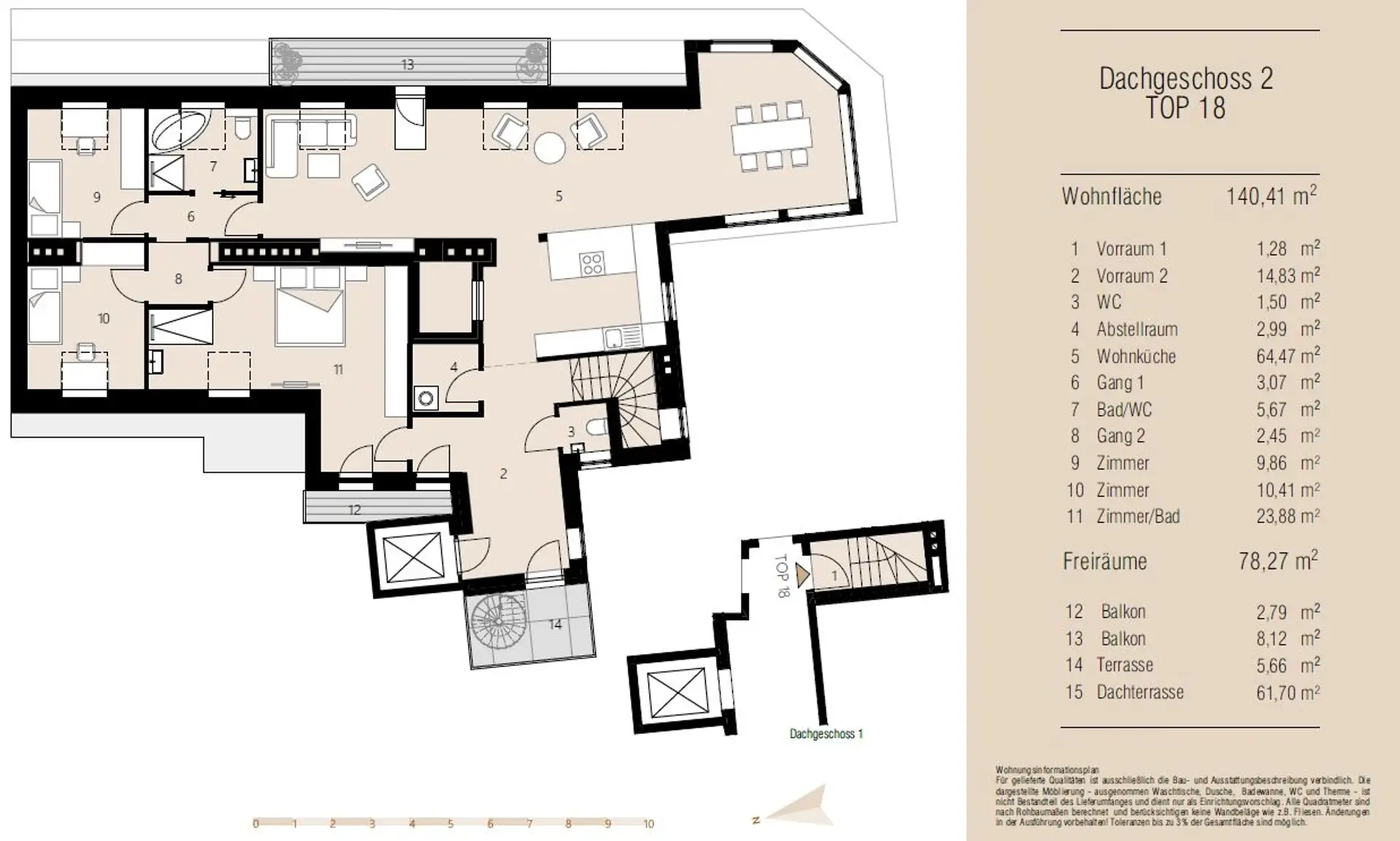 • zwei Balkone vom Wohnzimmer und Schlafzimmer sowie eine Terrasse vom Vorraum begehbar