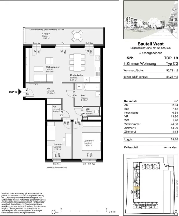 Diese elegant geschnittene 3 Zimmerwohnung mit ca. 81,24 m² befindet sich im 6. Obergeschoss mit Lift und vereint stillvolles Wohnen mit urbanem Komfort.
