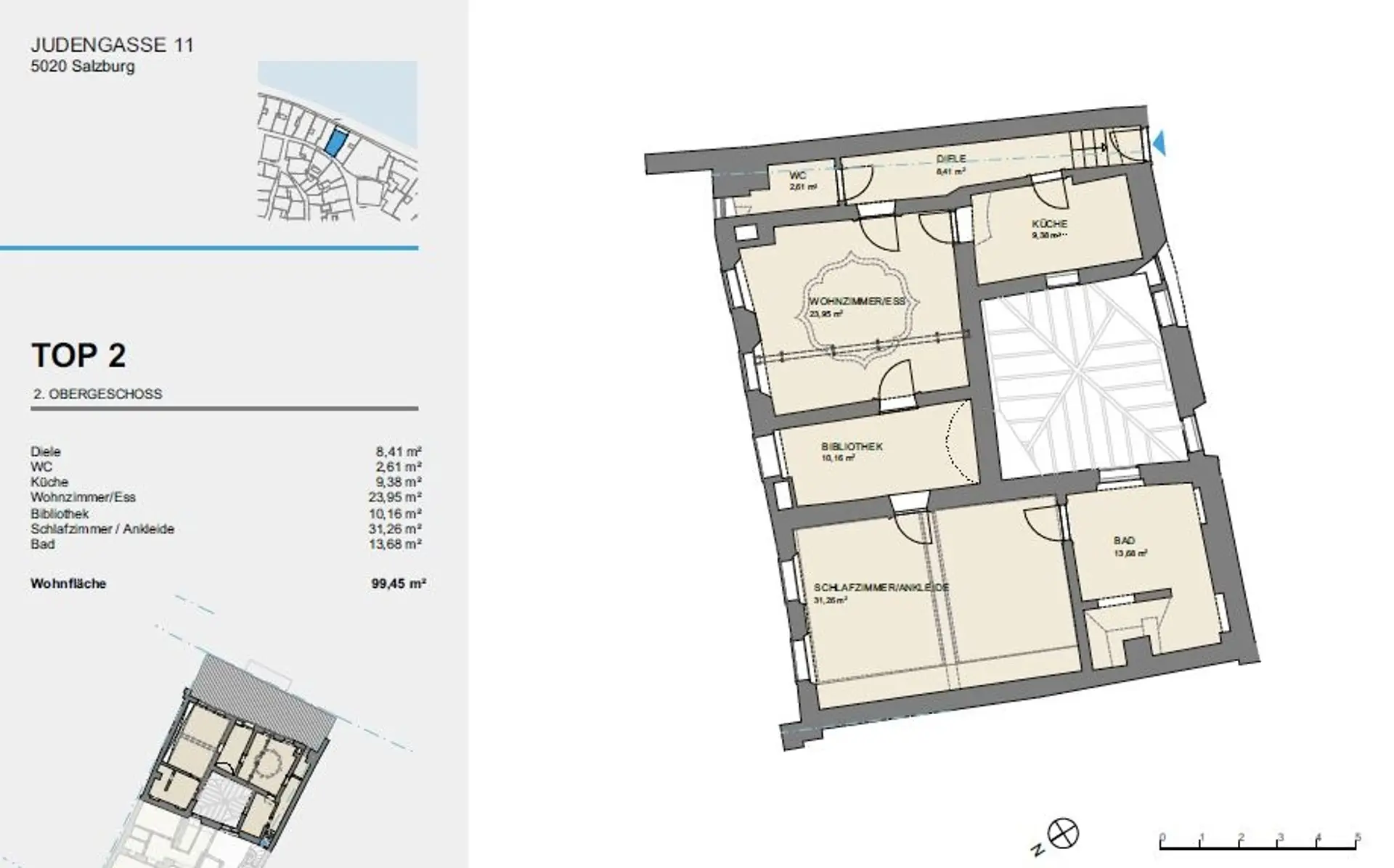 Zur Vermietung gelangt diese charmante 99 qm große Wohnung als Erstbezug nach Komplettsanierung, gelegen im 2. Liftstock einer neu revitalisierten Liegenschaft im Herzen der Salzburger Altstadt, in der Judengasse.